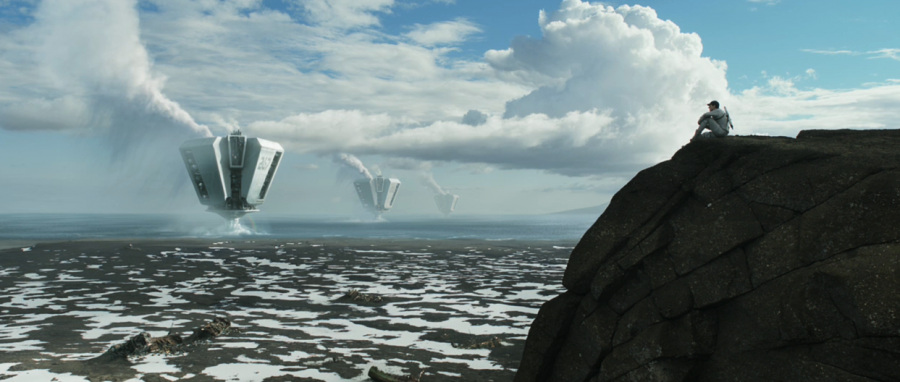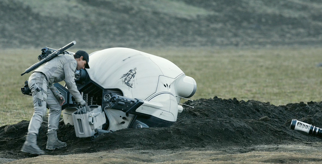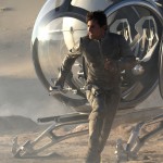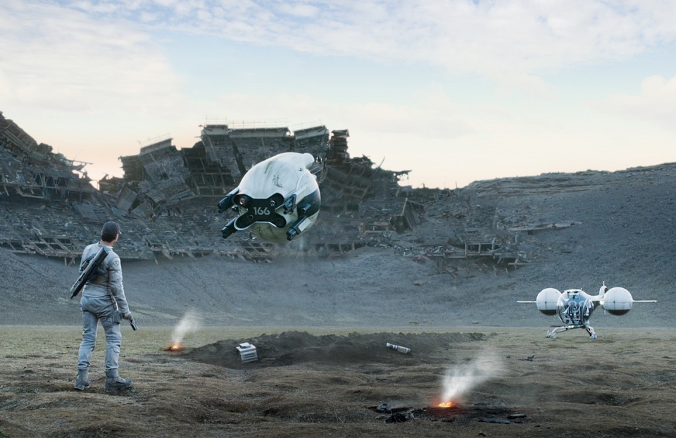 You’ll want to see this on the largest screen possible, as we get a lot of amazing aerial shots of the planet as Jack flies around in his dragon-fly-shaped aircraft, which itself is quite a marvel to witness. It’s all white chrome and glass, with smooth round surfaces, and it maneuvers like some sort of winged acrobat. It’s no wonder Jack spends so much of the movie inside of it. Plus he and Vica live high above Earth’s surface in a high-tech home/work station, complete with a glass pool, and as such his air-bug-thing is the only way to get to and from there.